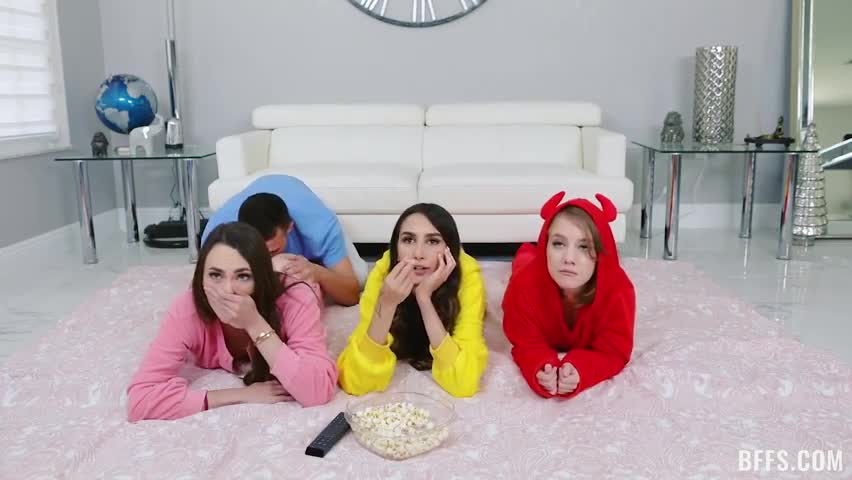 Natalia Nix is excited to have her two best friends Dani Damsel and Dakota Burns over for a movie night slumber party, so they get their onesies on, their popcorn ready and lay in the living room to watch a movie. Little did they know that Natalia’s brother Johnny had placed a secret camera and is challenging himself to turn all three girls’ attention on to his huge dick.