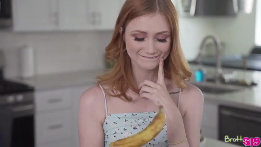 Fondling a banana gives redheaded minx Scarlet Skies an idea. Her brother, Alex Mack, comes to ask what’s going on. She stares at his crotch, then tells him that she was thinking about where guys’ dicks go when they’re wearing pants. Using the banana, Scarlet tests out a variety of dick poses until Alex tells her to cut it out. Later, Scarlet tells Alex that they’re supposed to be a family and that he needs to make it up to her that he was rude earlier. He can do that by telling her where the D goes while boys are wearing pants.